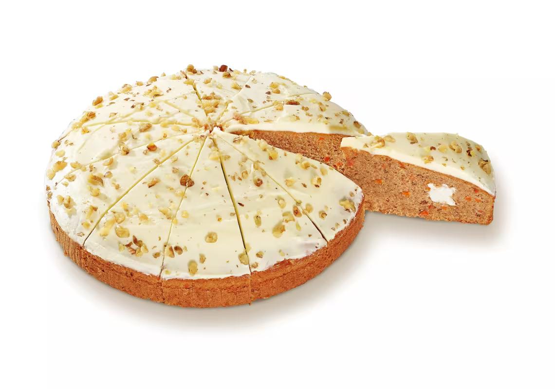 Sugar, vegetable oils and fats (rapeseed, palm, sunflower), flour (WHEAT), EGG, full fat soft cheese (MILK) (10.5%) (whole MILK, cream (MILK), salt, microbial rennet, starter culture, thickener (locust bean gum)), carrot, water, glucose syrup, WALNUTS (3.5%), cinnamon, raising agent (E450, E500), emulsifier (E471, E481), modified starch, salt, thickener (xanthan gum).