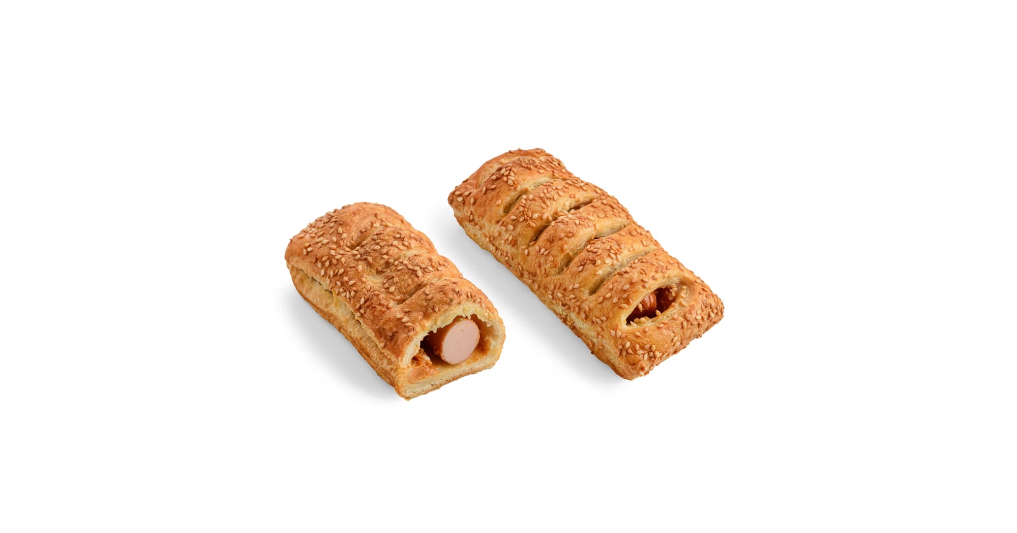 WHEAT flour, pork–poultry sausage (26.5 %) (pork meat, poultry meat, water, poultry fat, salt, connective tissue from chicken, glucose, soy protein, stabilisers, monosodium glutamate, antioxidants, spices and extracts, pork protein, preservative sodium nitrite), water, refined vegetable margarine (palm, sunflower, rapeseed oils; water; salt; emulsifier mono- and diglycerides of fatty acids; acidity regulator citric acid), ketchup (4.8 %), mustard (4.8 %), sesame seeds (2 %), sugar, yeast, iodised salt, modified starch, egg yolk powder, black pepper, flour treatment agent (ascorbic acid).